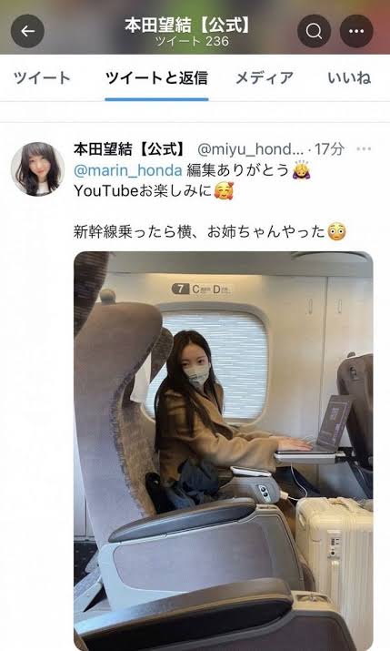 本田望結は、グリーン車と思われる車両にパソコンを開いて、こちらに視線を向けるフィギュアスケートの本田真凜の姿を激写して投稿。フォロワーからは「そんなんあるんや」「すご!奇跡や」「めちゃ、可愛い」「キャリアウーマン感がよき」などのコメントが寄せられた。