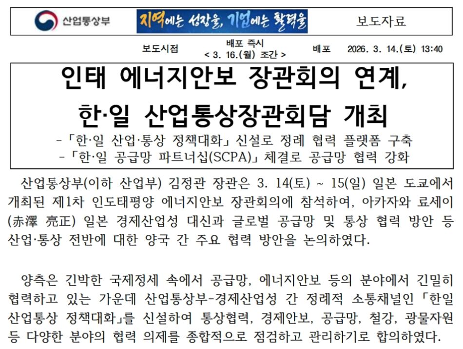 2026年03月14日、韓国の産業通商資源部が以下のようなプレスリリースを出しました。