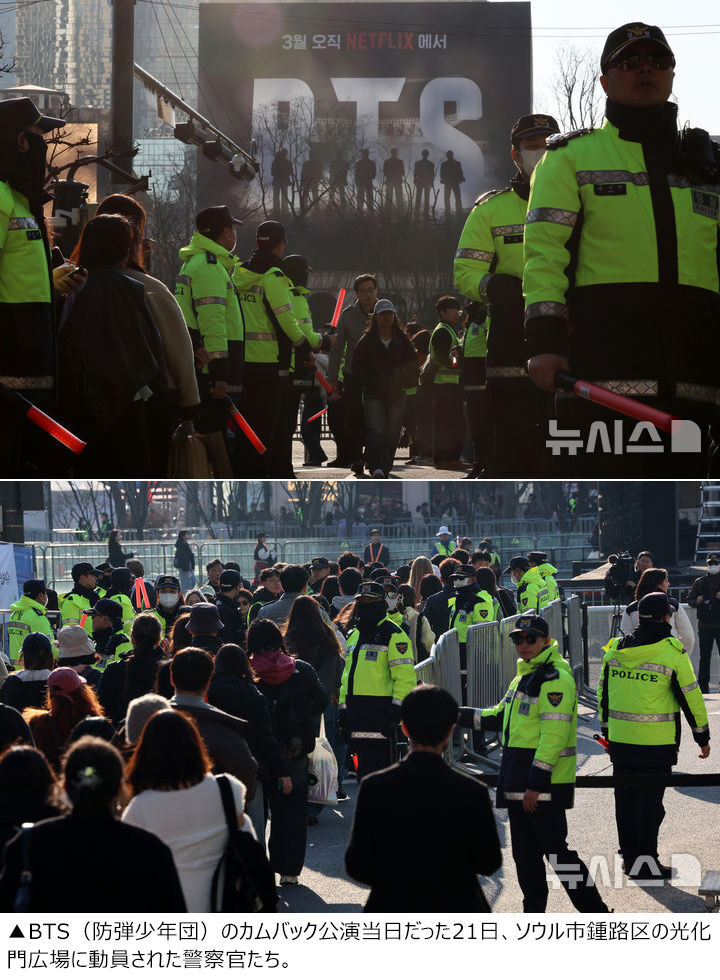 行事などの安全総括対応部処(省庁)である行政安全部はこうした予測を基に、BTSカムバック公演の安全対策を立て、同日の現場には合計1万5500人の安全対策要員が投入された。警察6700人、ソウル市2600人、消防800人、ソウル交通公社400人、行政安全部70人など、公務員・公共機関の職員だけで1万人を上回る。あとの約4800人はHYBEが動員した民間人員だ。