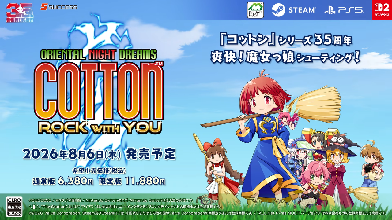 サクセスは本日(2026年3月26日)、シューティングゲーム「コットンロックウィズユー」(PC/Nintendo Switch 2/PlayStation 5)を8月6日に発売すると発表した。価格は通常版が6380円、限定版が1万1880円(いずれも税込)だ。
