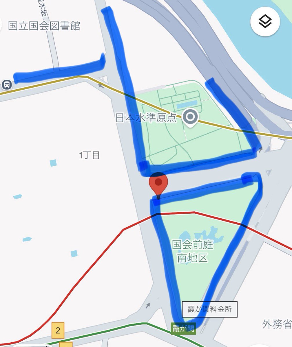 昨日の国会前デモを報じる記事について「2万4千人も写ってない」などの引用リプやヤフコメがついていますが、そもそも「撮れるわけがないだろ!」。昨日のデモは地図上の以下の青色部分の歩道を参加者が埋め尽くし、空撮以外で撮影する方法はありません。人数の推計を以下の形で算出できるので示しておきます。