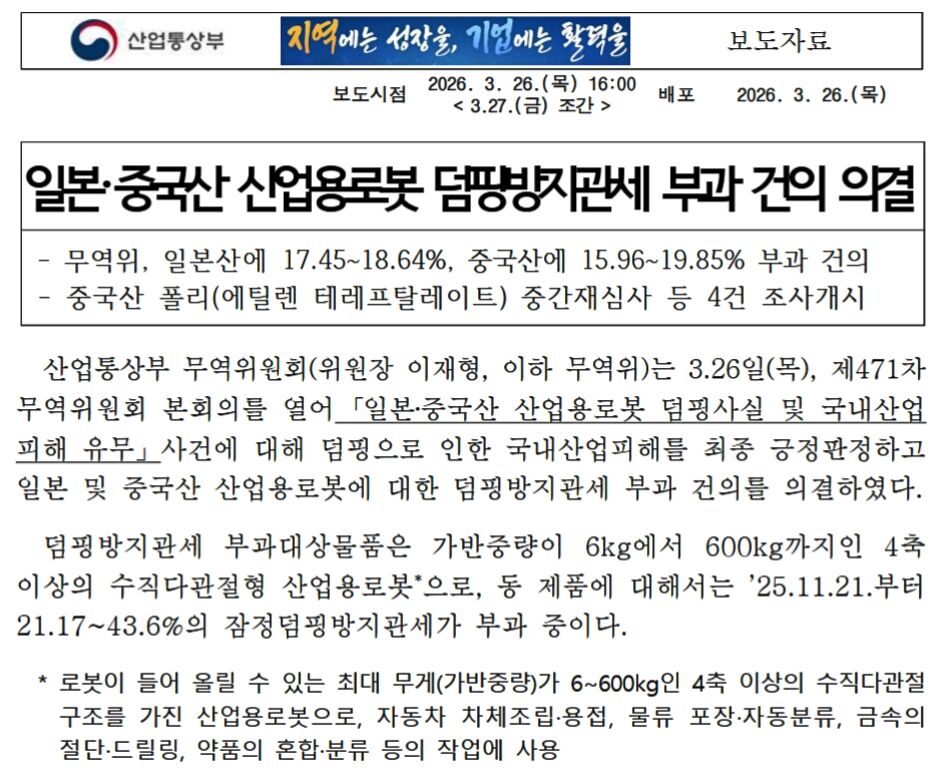 産業通商部貿易委員会(委員長 イ・ジェヒョン、以下 貿易委)は03月26日(木)、第471回貿易委員会本会議を開催し、「日本・中国産産業用ロボットのダンピング事実および国内産業被害の有無」事件について、ダンピングによる国内産業被害を最終的に肯定判定し、日本および中国産産業用ロボットに対するアンチダンピング関税賦課の建議を議決した。