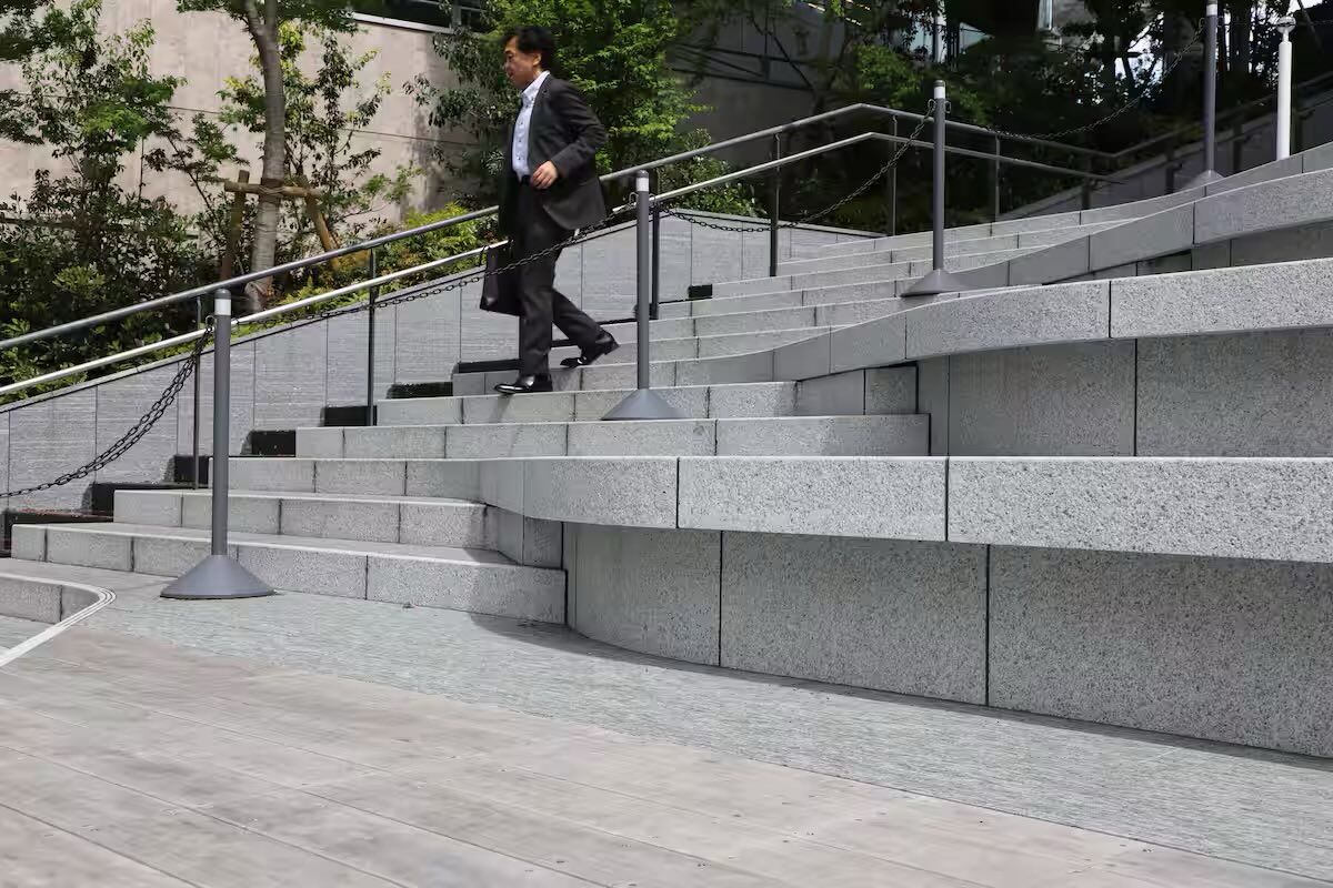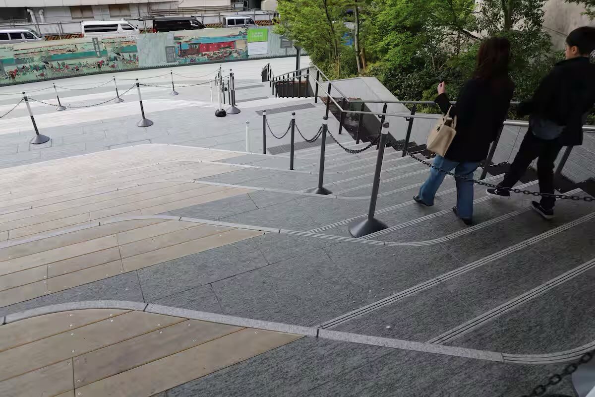 JR山手線の高輪ゲートウェイ駅(東京都港区)に直結し、3月28日に全面開業した複合施設「高輪ゲートウェイシティ」の敷地内に「目の錯覚で転倒する恐れがある」と指摘される「大階段」がある。これまでに少なくとも2人が転倒して負傷したことが確認されている。管理者のJR東日本も危険性を認識し、ベンチ周りにチェーンを張る安全対策を施した。他方、SNS上ではこの設備が著名建築家の隈研吾氏の設計だとする誤った情報が拡散しているが、JR東側、隈氏側双方が否定した。(外崎晃彦、写真も)