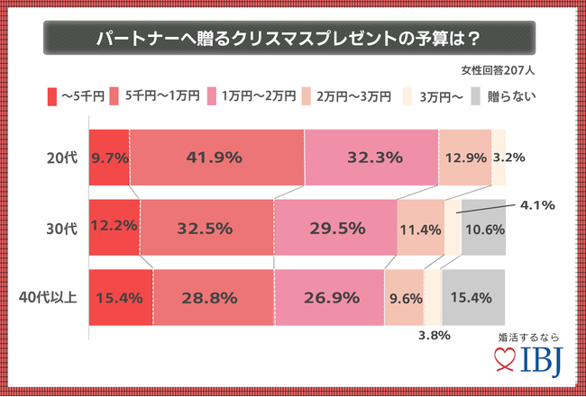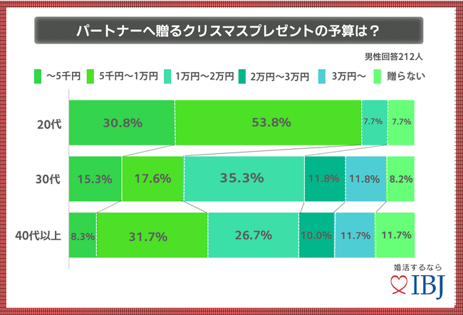 40代以上になると男女ともに予算が低くなり、中には「プレゼントを贈らない」という方もいるようです。