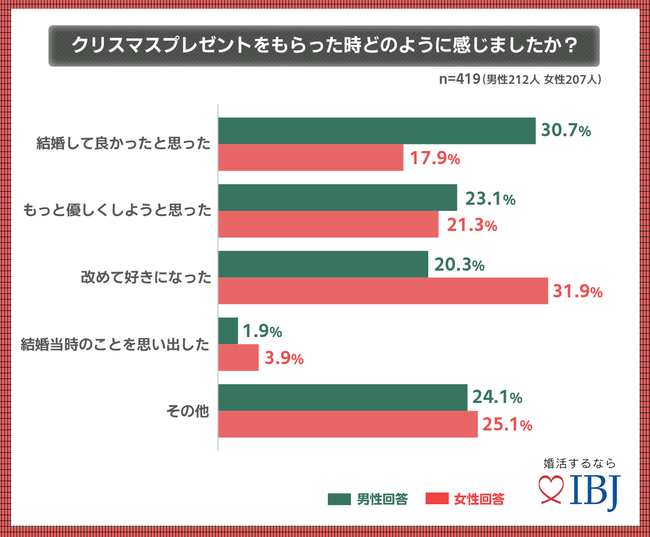 クリスマスプレゼントをもらうことで「結婚して良かった」「改めて好きになった」「もっと優しくしようと思った」と感じる方も多く、プレゼントを贈ることは”夫婦円満”でいるためのポイントとなるのかもしれません。