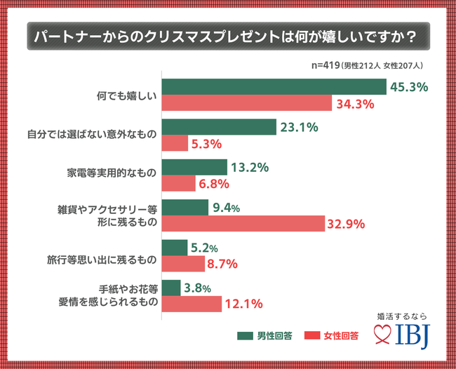 クリスマスプレゼントについて、男性の5割、女性の3割が「何でも嬉しい」と回答。