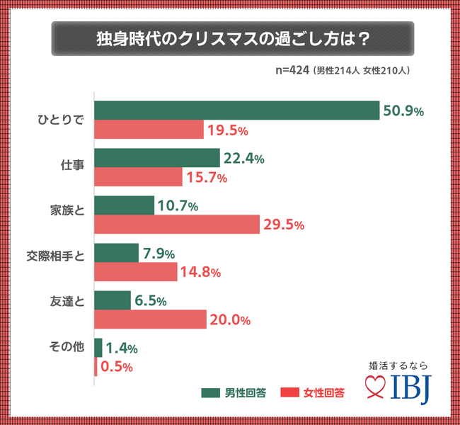 まず、独身時代のクリスマスの過ごし方として、男性の半数は「ひとり」で過ごしていた一方、女性は「家族」と過ごしていた方が3割に。