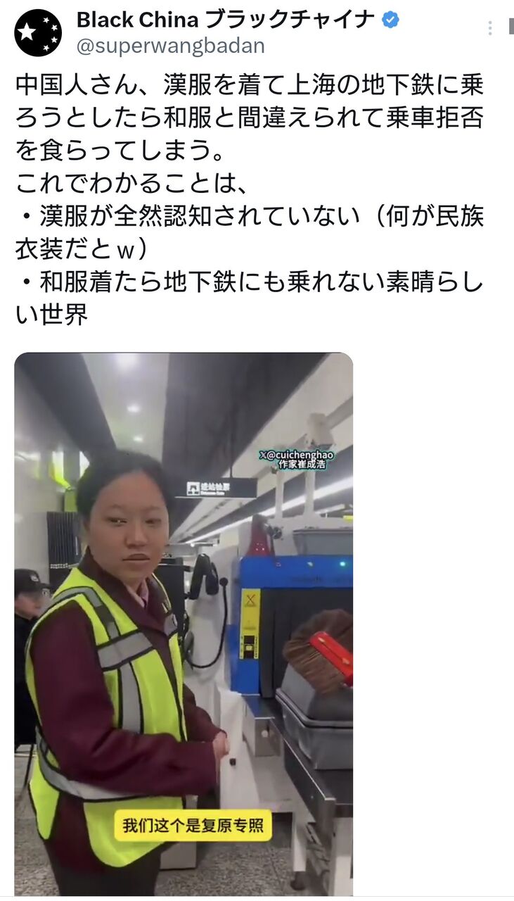 中国人さん、漢服を着て上海の地下鉄に乗ろうとしたら和服と間違えられて乗車拒否を食らう