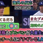 【仰天】先発の好投もブルペンが大量失点で敗戦。期待外れチームにブチギレるドジャースファン