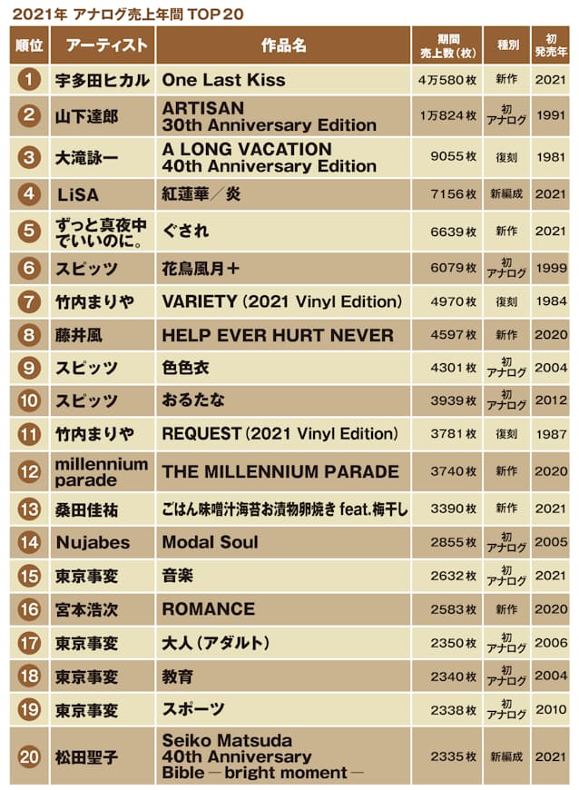 トップ10を見ると、20年はゼロだった累計1万枚以上の作品が2作。その中で『エヴァンゲリオン』劇場版シリーズのテーマソング等を集めた宇多田ヒカルのEP盤『One Last Kiss』は4万枚と群を抜いてトップ。CDは碇シンジ、アナログ盤は綾波レイがそれぞれ描かれた原画風のジャケットも購入を促進しただろうが、何より安定のハイ・クオリティーな楽曲やサウンドが大きな要因だろう。