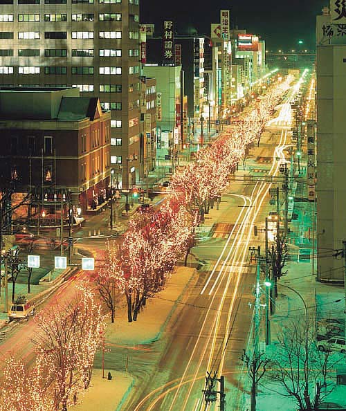 旭川の中心市街地、平和通買物公園、緑橋通、昭和通、7条緑道、常盤ロータリーの5エリアに約14万球のイルミが灯る。