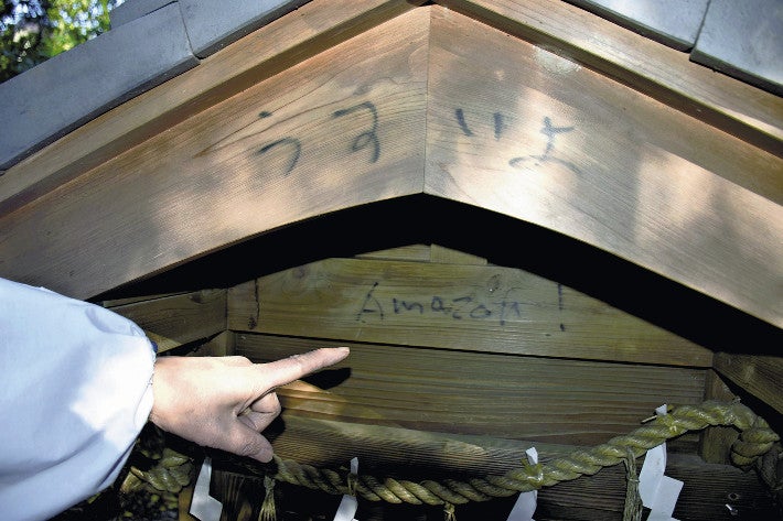 関係者によると、落書きがあったのは、櫻木神社では日天社の壁など計13か所。愛宕神社は手水舎の柱など計5か所。「うすいよ」の文字や、「Brazilからの使者 Amazon!」などと、いずれも黒いペンのようなもので書かれていた。