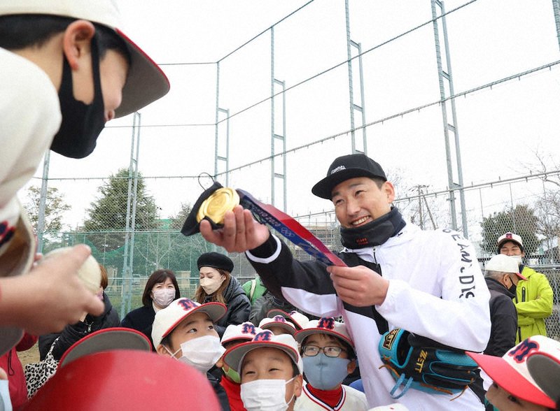《サプライズ登場に歓声》「岩崎優の夢授業」は16年から今回が6回目で、この日は「三国少年野球団」の約60人が参加した。子どもたちに事前告知はなく、練習中にジャージー姿にグラブを持った岩崎が登場すると、どよめきと歓声が起こった。キャッチボール、けん制練習などを見守り、最後は打撃投手を務めて全員と対戦。今年1月のオンラインによる「夢授業」にも参加した岡前泰河君(10)は「ピッチャーで投げる時はバランスが大事だと教わりました」とうなずき、バッテリーを組む難波輝人君も「ボールが速い。体が大きかった」と声を弾ませた。
