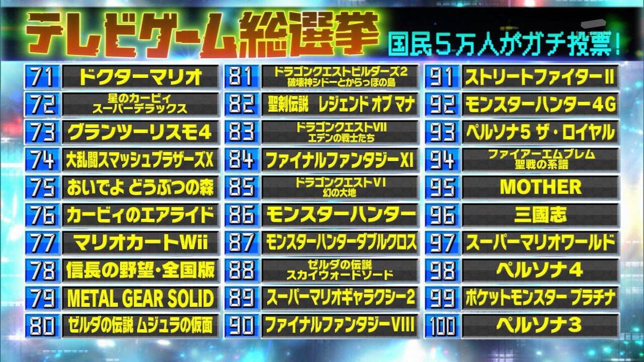 「テレビゲーム総選挙」は、各ユーザーがアンケートで答えた“好きなゲームベスト5”の調査をもとに、日本でもっとも人気のゲームTOP100を決めるという番組だ。