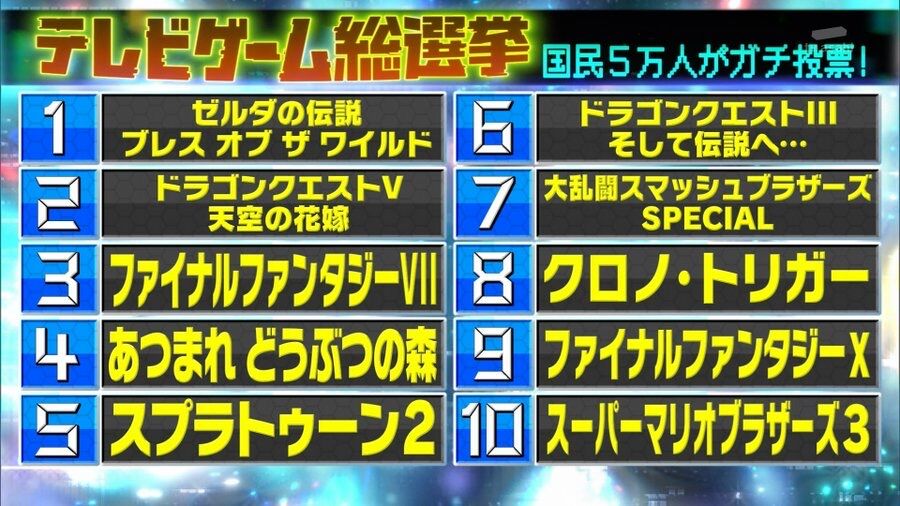 テレビ朝日系の特別番組「国民5万人がガチ投票!テレビゲーム総選挙」が12月27日(月)19時から3時間にわたり放送され、1位が『ゼルダの伝説 ブレス オブ ザ ワイルド』となったことが明らかとなった。2位は『ドラゴンクエストV』、3位は『ファイナルファンタジーVII』となっている。