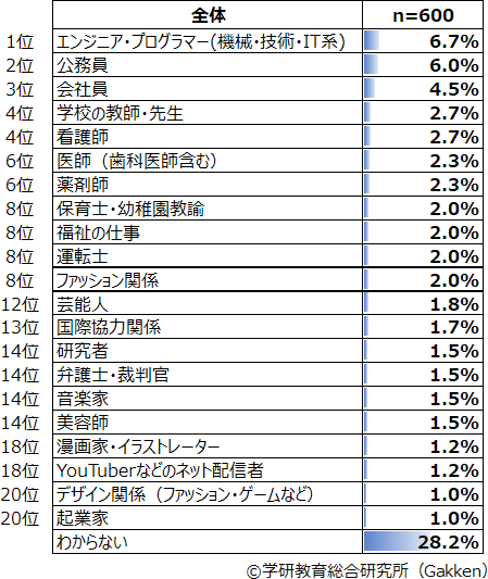 高校生のなりたい職業1位は「エンジニア・プログラマー」――こんな調査結果を、学研教育総合研究所が12月24日に発表した。性別・学年別では男子全学年と、1年生女子の部門で1位を獲得した。