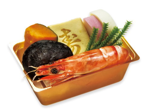 「こせち」の内容は、エビスかぼちゃ含め煮、焼き海老、寿高野豆腐、椎茸含め煮、かまぼこ(紅)、かまぼこ(白)。