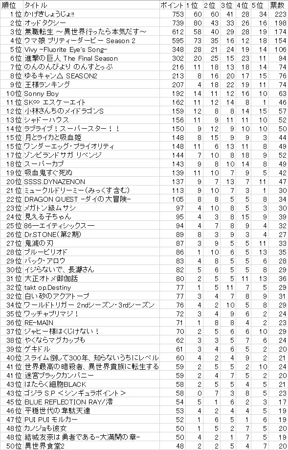 2021年 5chベストアニメランキング投票スレ
