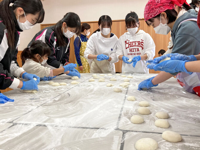 1人暮らしの高齢者たちに届けるため、つきたての餅を丸める高校生たち