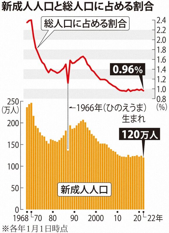 新年を20歳で迎える新成人は120万人で、総務省が推計を取り始めた昭和43年以降最も少なくなり、12年連続で日本の総人口の1%を下回りました。