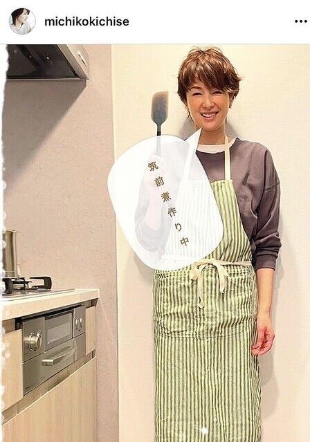 吉瀬は「これから味入れ わが家の筑前煮は父の味 美味しくなーれ」と記し、キッチンでグリーンのストライプのエプロンをつけて「筑前煮作り中」と吹き出しに文字をのせた写真と、鶏肉やにんじん、レンコン、こんにゃくなどがはいった筑前煮の写真をアップした。