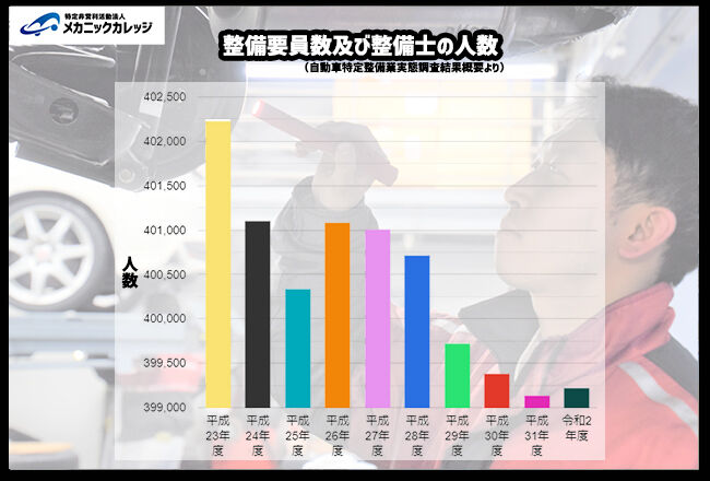 自動車整備士は年々減少しているだけではなく、平成29年度以降は40万人を切ってしまった事がわかります。