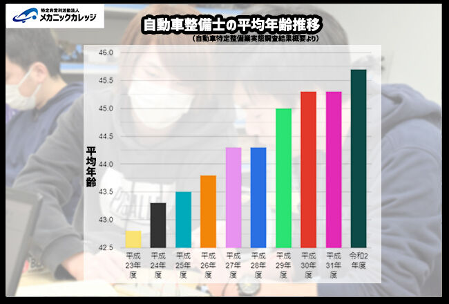 自動車整備士の平均年齢は年々上昇しており、平成29年度以降はとうとう平均年齢が45歳を超えました。