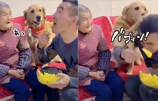 男性はフルーツを一切れ串に刺し、ゴールデンに差し出す。するとゴールデンはおばあさんの腕を軽く抑える。どうやら、「自分より先におばあさんに食べさせてあげて」の合図だったようだ。