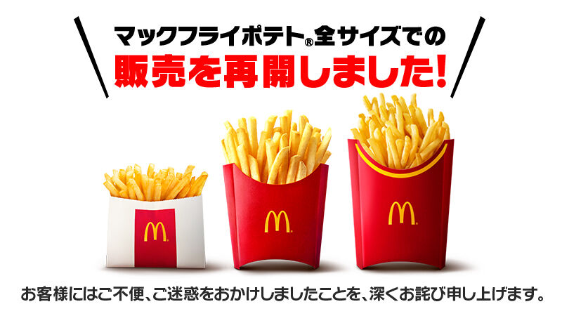 【朗報!】マクドナルド、ポテト全サイズの販売再開 !←お客様にご迷惑をおかけしました・・・