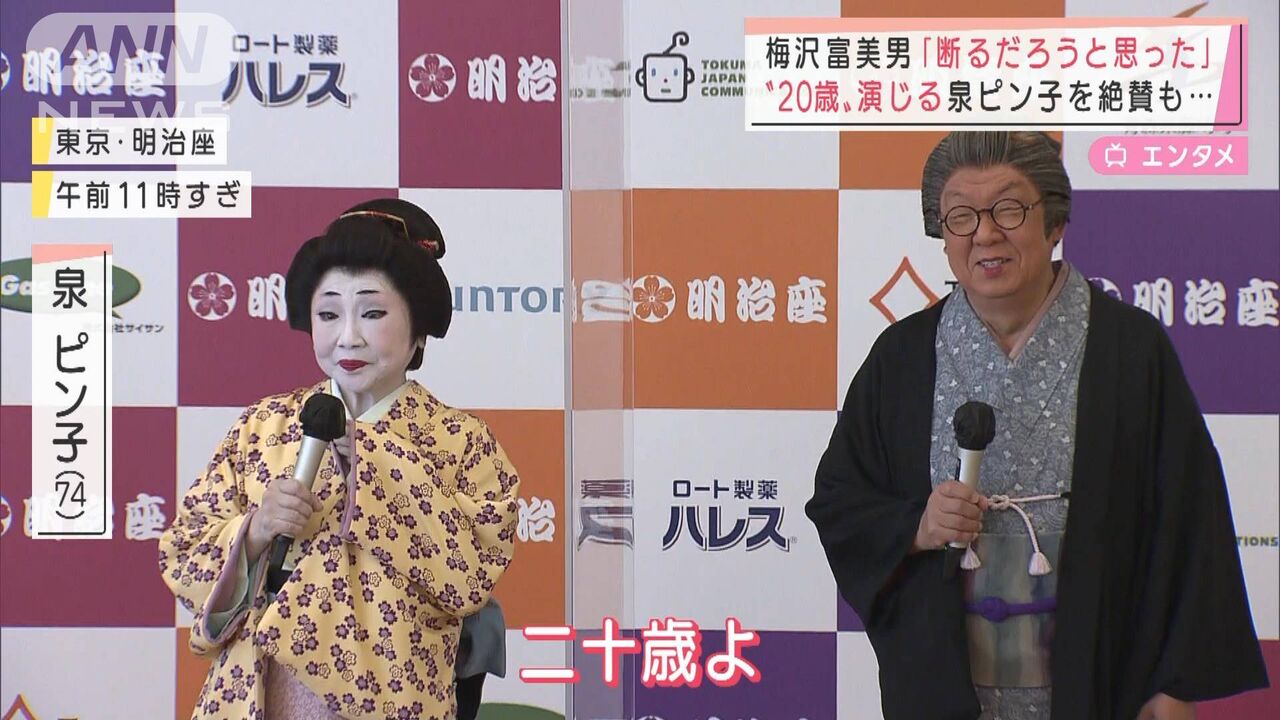 梅沢は「ピン子さんとは38年前から友達で仲良くやって来ましたが、テレビでしか共演していなかった。私も自称ですけど300年に1人の役者だから、ぜひとも共演したかった。扱いにくいのかなと思ったけど、素晴らしかった。久しぶりにいい女優といい芝居ができたなと思いました」と話した。