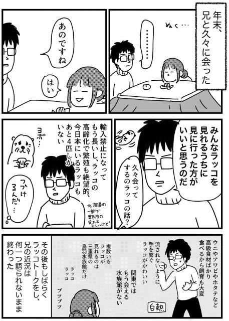 ラッコトークは白熱し、結局、兄の近況は何一つ語られなかった、という「日常の一コマ」を描きました。