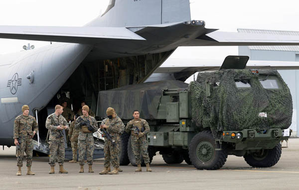 日米共同訓練で、米軍輸送機から降ろされる海兵隊の高機動ロケット砲システム「ハイマース」=青森県八戸市の海上自衛隊八戸航空基地(C)共同通信社
