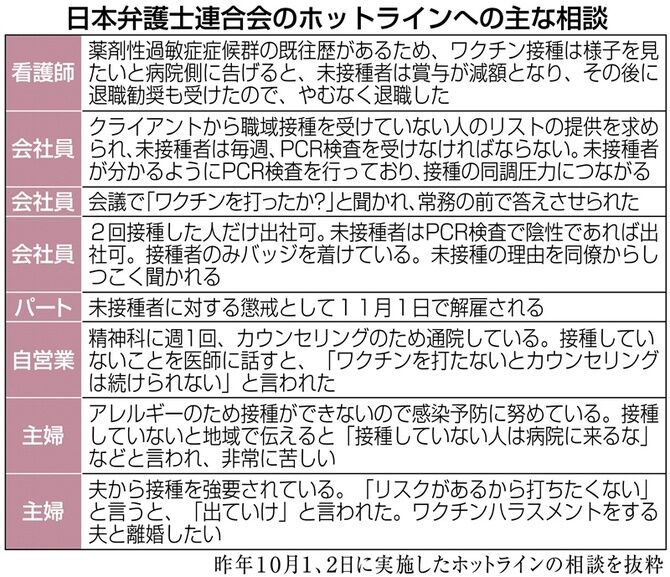 新型コロナウイルスのワクチンを接種していない人が、職場などで不当な扱いを受ける例が目立っている。