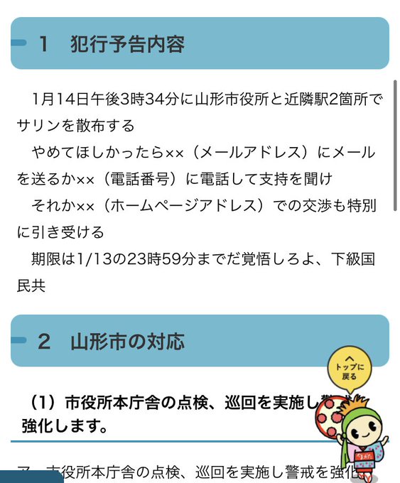 【恐怖!!!】「サリンを散布する」・・・ 山形市HPに犯行予告