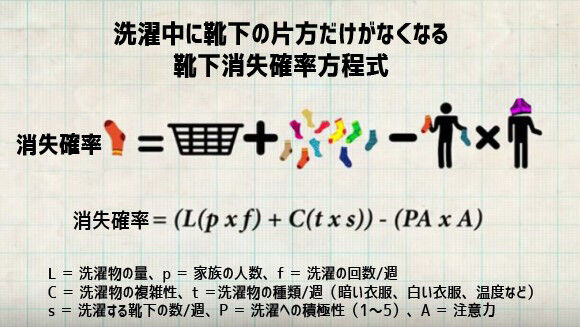こうして得られた数値から洗濯への積極性(1~5。1なら洗濯が大嫌い、5なら洗濯が大好き)と注意力(洗濯前にポケットを確認する回数、服をきちんと表向きにした回数、袖や靴下をきちんと伸ばした回数で計測)を乗じたものを引く。これが靴下が行方不明になってしまう確率だ。