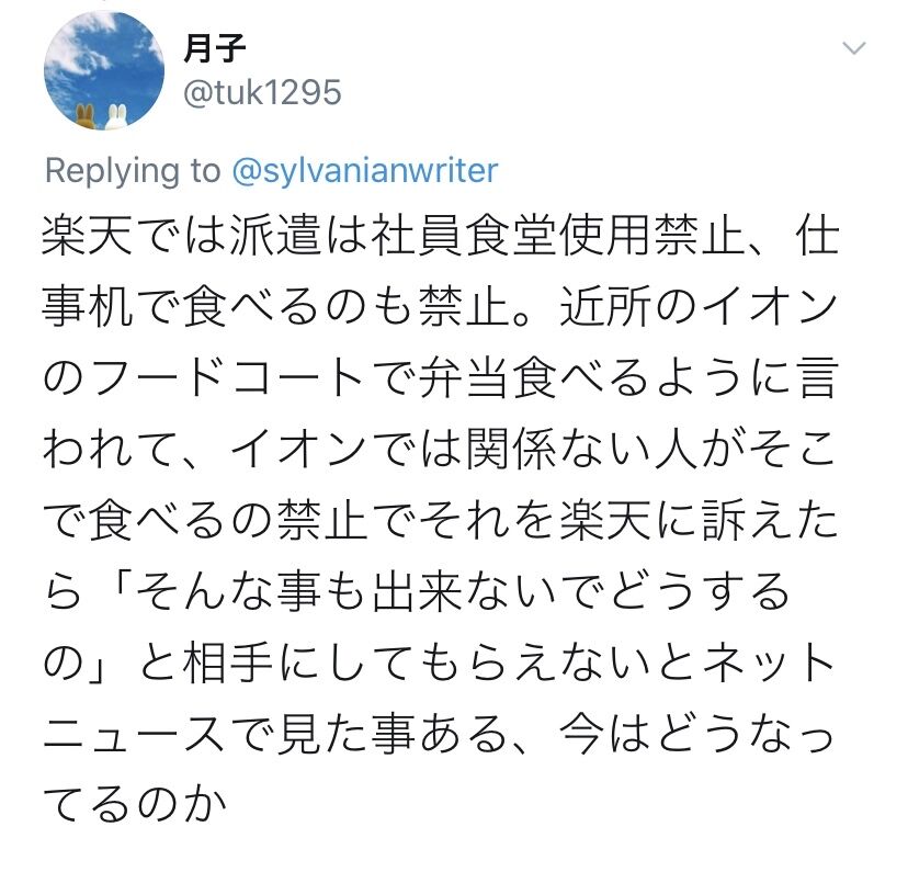(出典 楽天「あ、派遣さんは社員食堂利用禁止です。隣のイオンで食べてください」 派遣社員「…はい」)