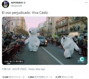 1月5日、昨年はパンデミックの影響で中止となっていた毎年恒例の伝統行事であるパレードがスペインで開催された。多くの人が沿道で華やかな演出を楽しんでいたが、パレードに参加していたシロクマの着ぐるみが残念な姿で歩く姿が捉えられ、多くの人の笑いを誘った。『Olive Press』などが伝えている。
