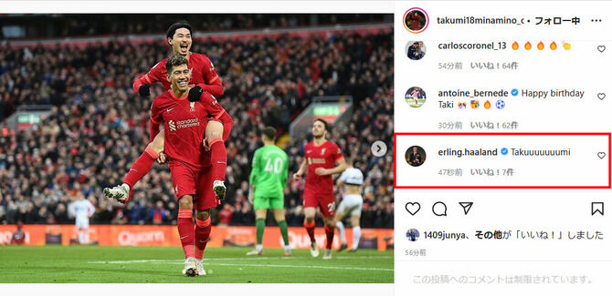 【朗報】南野タキのバースデイゴール、元同僚のハーランドからコメントキターwwwwwwwwww