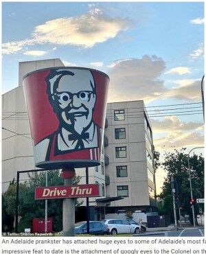 画像は『WhatsNew2Day 2022年1月14日付「Prankster Puts Googly Eyes On KFC’s Colonel Sanders, Dan Murphy’s And Jim’s Faces In Adelaide」(Twitter/Sharon Hepworth)(Facebook)』のスクリーンショット