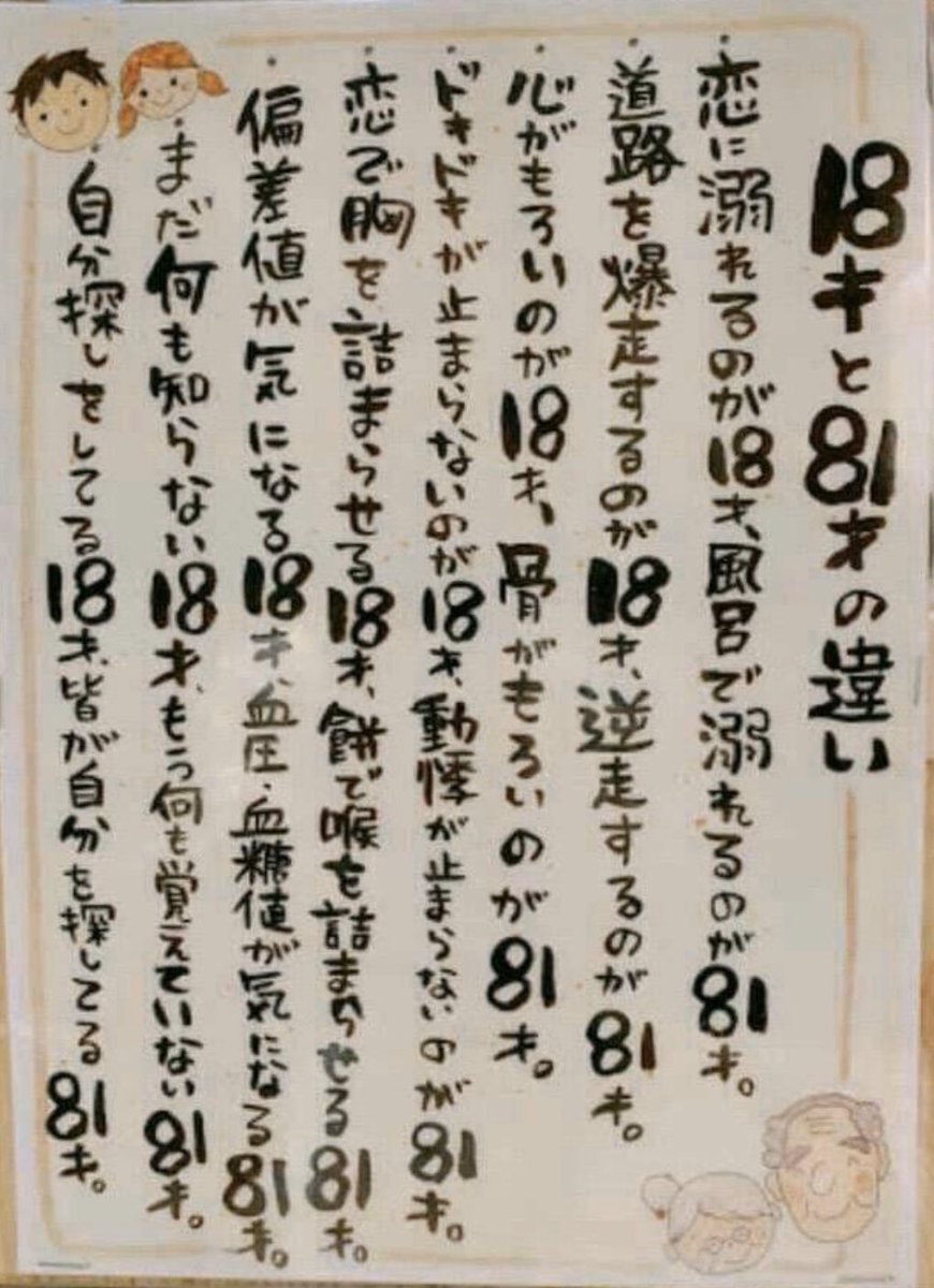 「18才と81才の違い」について書かれた貼り紙に爆笑 元ネタは「笑点」の大喜利コーナー|まいどなニュース