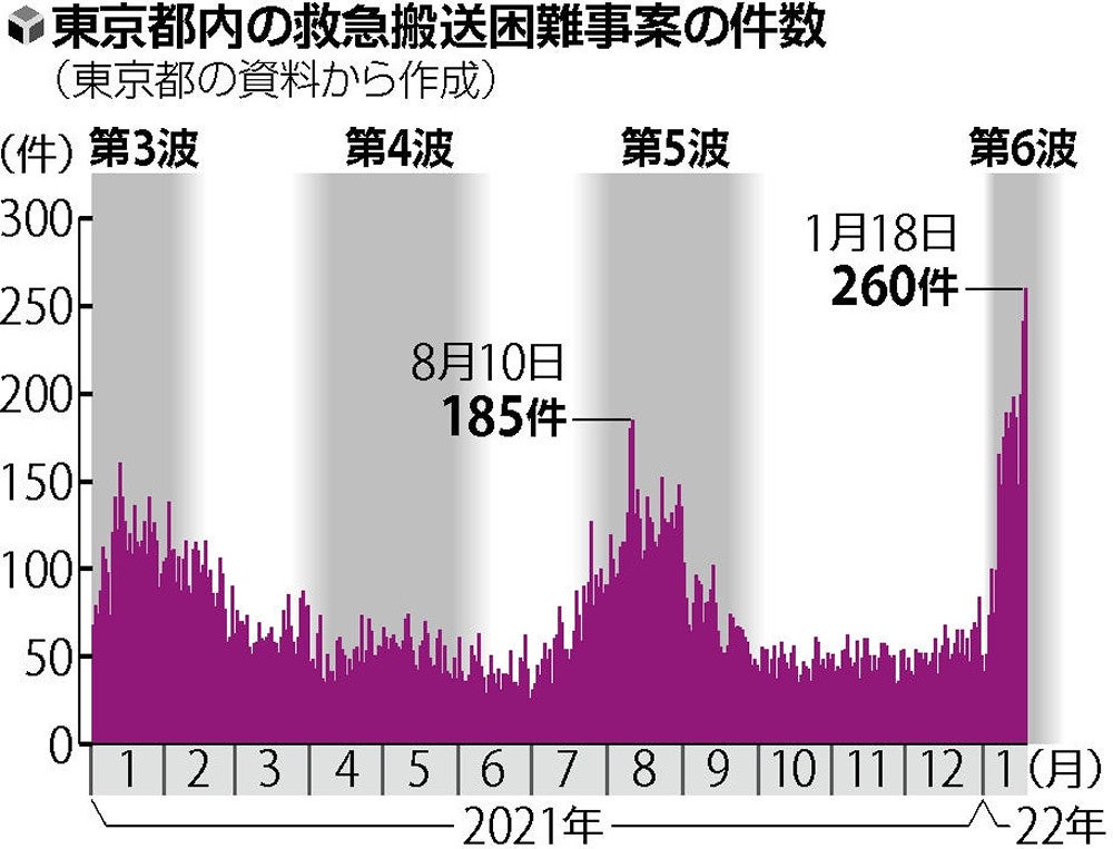 「救急搬送困難事案」(東京ルール)は今年に入り急増している。17日に200件を超え、第5波のピーク(185件)を上回った。
