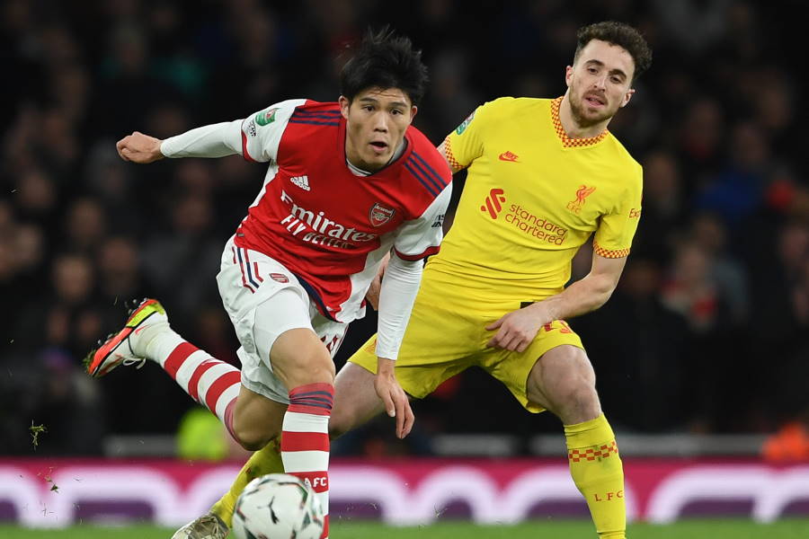 イングランド1部アーセナルの日本代表DF冨安健洋は現地時間1月20日に行われたリーグカップ準決勝第2戦のリバプール戦(0-2)にスタメンフル出場したが、先制点の場面ではポルトガル代表FWディオゴ・ジョッタにドリブル突破を許すなど低調なパフォーマンスに終わり、チームも敗退。日本代表DFは現地メディアから厳しい評価を下されている。
