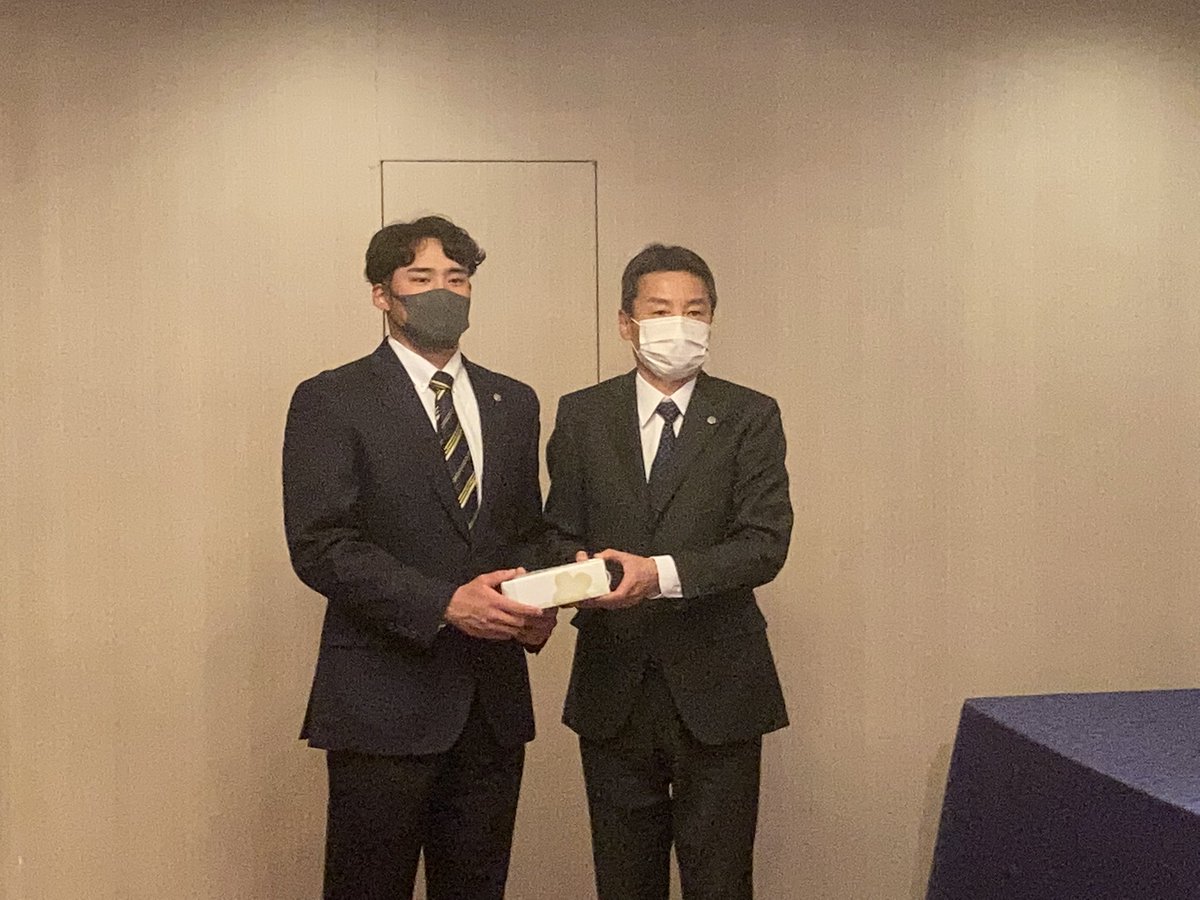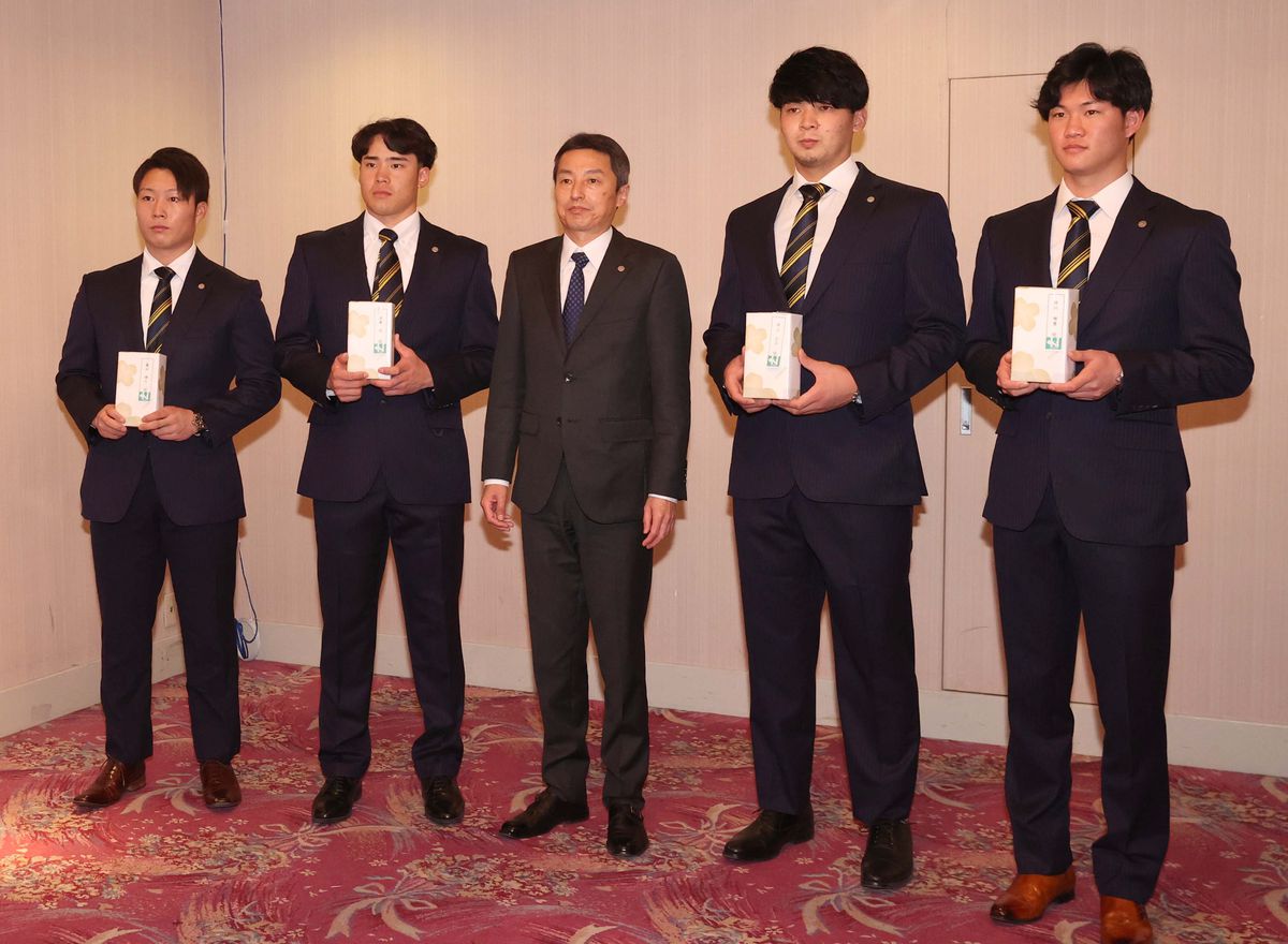 新成人の阪神・井上広大外野手(20)、及川雅貴投手(20)、遠藤成内野手(20)、藤田健斗捕手(20)が21日、兵庫・西宮市内で行われた「成人式記念品授与式」に出席した。