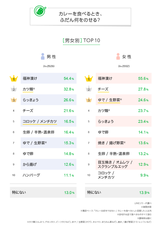 男女別でみると、男性は1位「ビーフカレー」(65.9%)、2位「カツカレー」(65.1%)で僅差となり、この2種は女性よりも高い割合に。一方女性では、4位「キーマカレー / ドライカレー」(47.1%)、6位「バターチキンカレー」(42.3%)、7位「野菜カレー」(34.0%)、9位「スープカレー」(24.6%)が男性よりも割合が高く、野菜系である「ほうれん草のカレー」(24.1%)もランクインした。