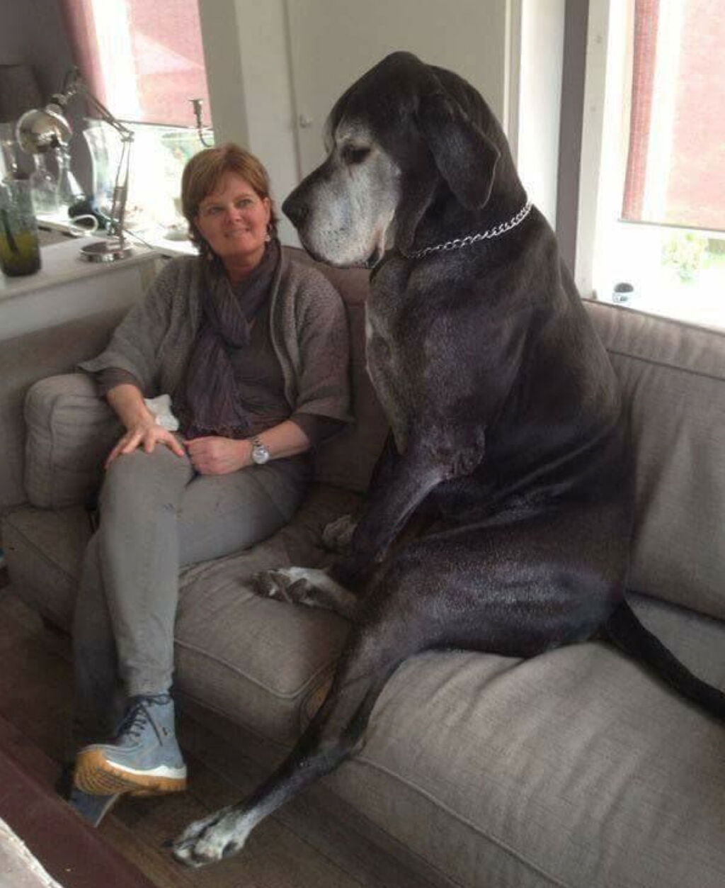 グレートデーンは人間の大人並みの体重を持ち、体高も80cm前後とかなり巨大だが、穏和でやさしい性格で、「優しい巨人」とも呼ばれている。