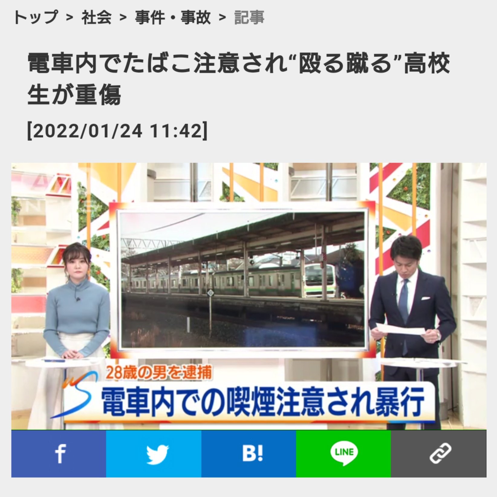 【恐怖】電車内で「お兄さんたばこ吸ってますよね。やめてもらえませんか。」と28歳男性に注意←結果、殴る蹴るされ高校生が重傷