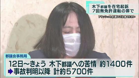 昨年7月の東京都議選の期間中などに無免許運転を7回したとして道路交通法違反の罪で在宅起訴された元都議・木下富美子被告(55)の初公判が25日、東京地裁(平出喜一裁判官)であった。検察側は木下元都議が2017~21年の4年間で交通違反を12回繰り返し、免許停止処分も過去に4回受けていた点を指摘し、「極めて悪質で法令順守の意識が欠落している」として懲役10カ月を求刑した。判決は2月15日に言い渡される。