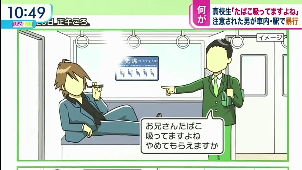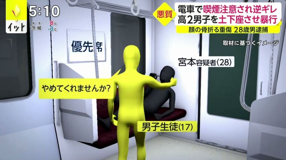 【民度】電車内でたばこ注意した高校生に逆ギレ暴行 宮本一馬の凶行に他の乗客は見ているだけで誰も声をかけず止めようとせず in日本★5