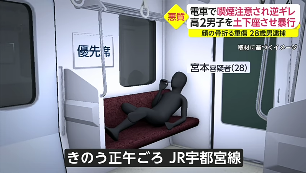 署によると、宮本容疑者は知人と2人でJR宇都宮駅から乗車。男子生徒は友人らと4人で乗車していたという。宮本容疑者は優先席で寝っ転がりながら、加熱式のたばこを吸っていたところ、男子生徒が喫煙を注意した。宮本容疑者は激高し、男子生徒に暴行を加えた。車内で男子生徒に土下座を要求し、自治医大駅のホームに連れ出した後も暴行を続けたという。駅員が止めに入り警察に通報した。