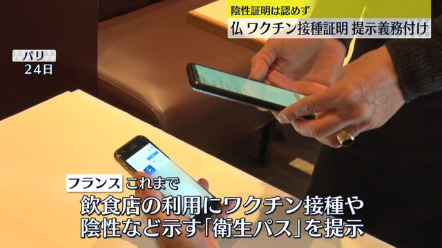 フランスでは、飲食店などを利用する際には新型コロナウイルスのワクチンの接種証明か検査の陰性証明の提示が必要でしたが、変異ウイルス、オミクロン株の感染拡大を受けて、24日、接種証明のみを認める法律が施行されました。